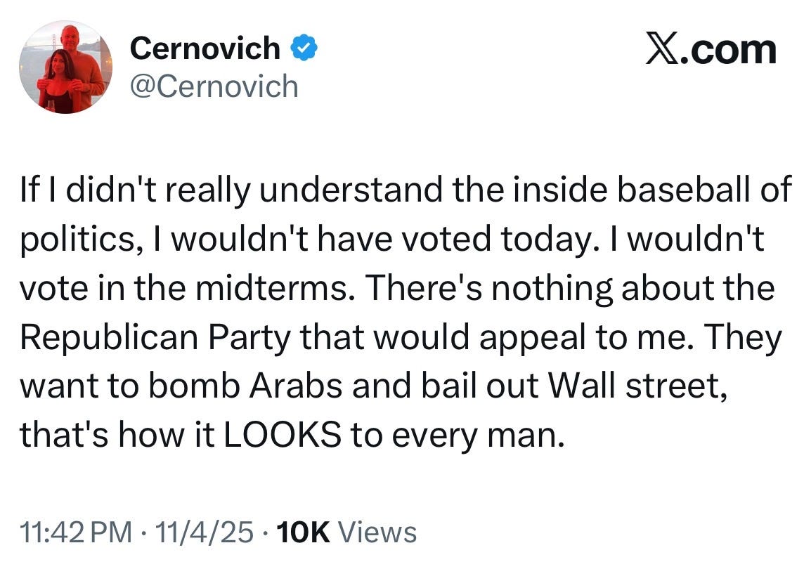But it was clear that this sponsored messaging, which had reached a fever pitch before the election, had failed. And the loss was not just a defeat. It was an obliteration. In New York. In New Jersey. In Virginia. And across ballot measures nationwide. Mamdani’s victory represents the beginning of a bulwark against Trump 2.5.
