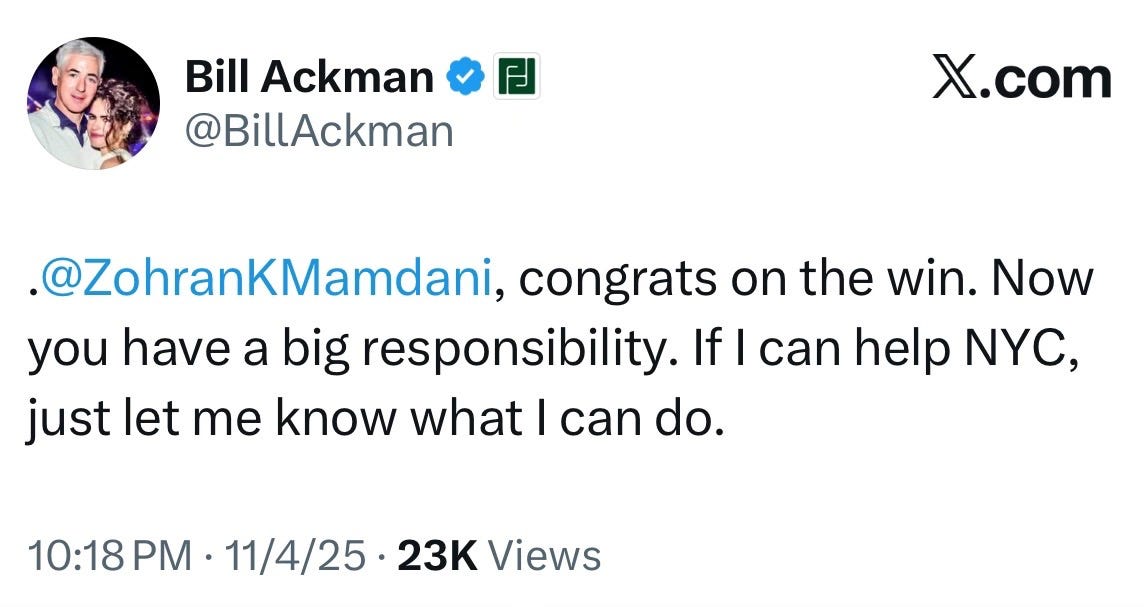 Before his victory, Mamdani stood relatively alone, with tepid endorsements even from his own party. On November 5, he has the wind in his sails. Nothing attracts losers like winning. Even Bill Ackman pledged to work with Mayor Mamdani.